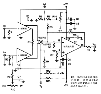 三、自动增益控制 TL026在一个8脚封装里提供差分输入与差分输出,它有50MHZ频宽、38dB最大增益及50dB的AGC范围,在其AGC针脚相对于参考针脚有±180MV的电压变化时,就会令其增益从最小变至最大——图5。 CLC520以一个14脚封装提供160MHz较大的频宽、40dB AGC范围、以及差分输入单端输出。这元件的最大增益由一个外接电阻预设,预设之增益可定于由+6dB 至最大+40dB。而设定在+6dB时,压控增益范围便从+6dB至少于-34dB,又设定在+40dB时,压控增益则由+40dB至少0dB。 CLC520提供高阻抗、差分电压输入,以优于0.5℃线性相位偏差下高达60MHz,及在4V PK-PK输出时仅有0.04%信号非线性。